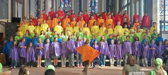 Lange hatten sich die Kinder und Jugendlichen der Eschweger Kurrende auf das große Ereignis vorbereitet. Am 20. September war es dann so weit: mit ihrer Leiterin Kantorin Juliane Baumann-Kremzow fuhren sie nach Kassel zum Landeskinderchortag. Dort erlebten rund 300 Kinder aus der ganzen Landeskirche und ihr Publikum eine musikalische Veranstaltung voller Fantasie, Klang und Gemeinschaft. Im Mittelpunkt stand das eigens für die Chortage komponierte Stück «Die Schöpfung singt» von Peter Schindler (Musik) und Babette Dieterich (Text) – eine bunte Revue mit Theaterszenen, Choreografien und viel Musik. Die Kinder schlüpften in Rollen wie «Chor der Bäume», «Chor der Regentropfen» oder «Chor der Steine» und erzählten singend von ihrer Bedeutung für die Erde. Am Ende wurde aus dem «Waldchor» ein leuchtender Regenbogen – Symbol für Vielfalt, Hoffnung und Gottes Bund mit den Menschen.
